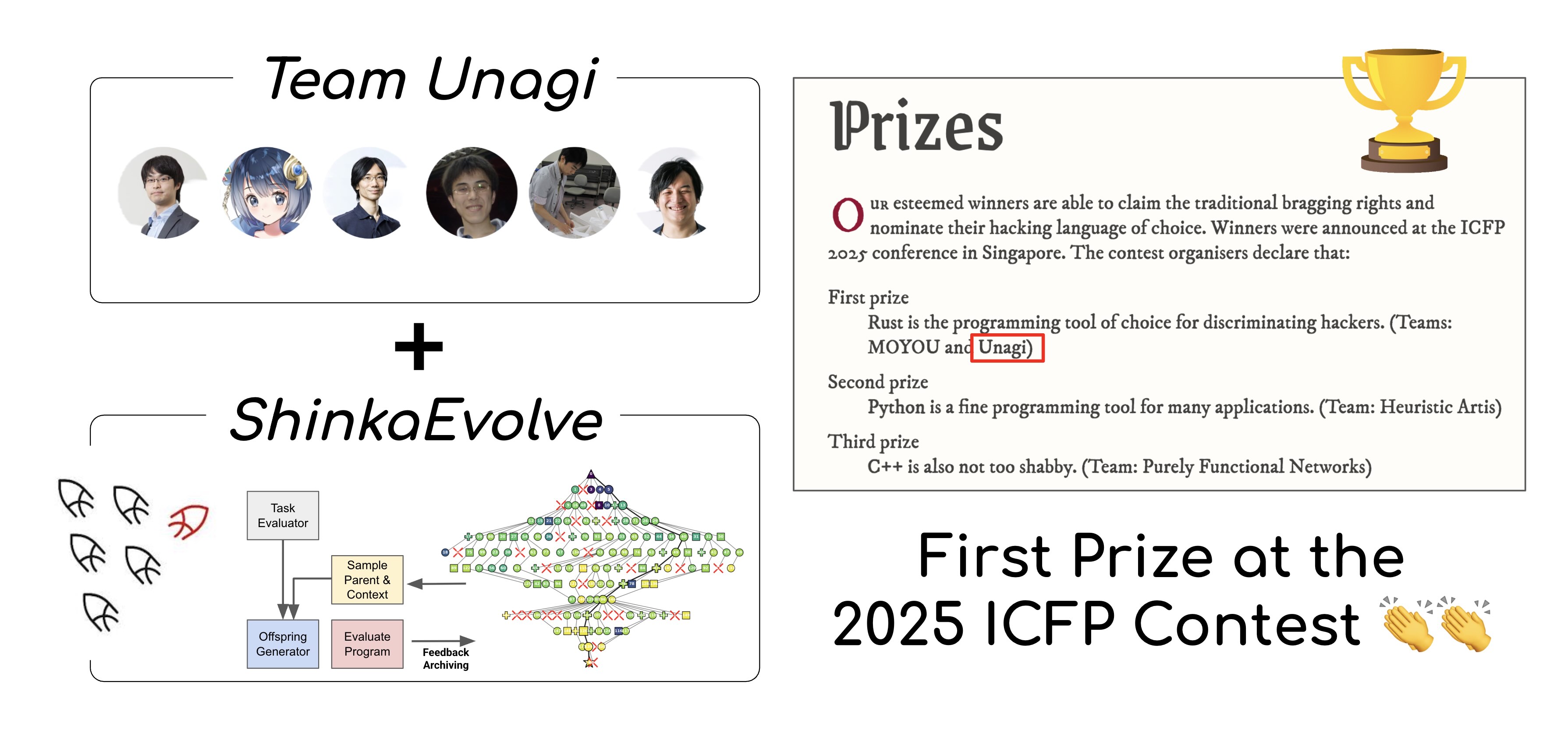 Sakana AI proposed new AI solutions in both the biodefense and disinformation countermeasure categories at a competition jointly hosted by the US Department of Defense’s Defense Innovation Unit (DIU) and the Japanese Ministry of Defense’s Acquisition, Technology & Logistics Agency (ATLA). Out of 60 companies from around the world who participated, Sakana AI won one of the three awards at the competition.