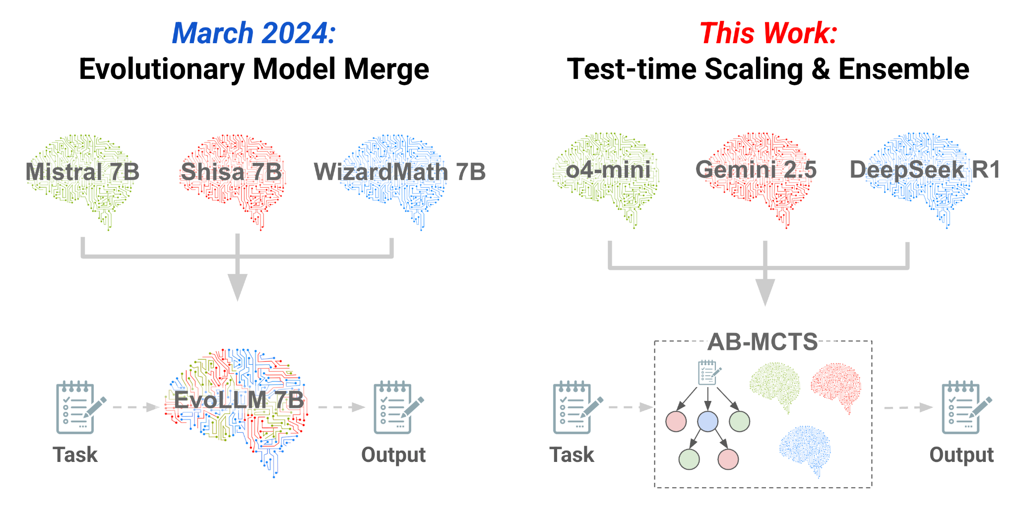 Following our 2024 research on evolutionary model merging, a technique for “mixing to create” better models from existing ones (left), we are now tackling the challenge of “mixing to use” frontier models (right). We have developed AB-MCTS, a new inference-time scaling algorithm that enables multiple frontier AI models to cooperate, achieving promising initial results on the ARC-AGI-2 benchmark.