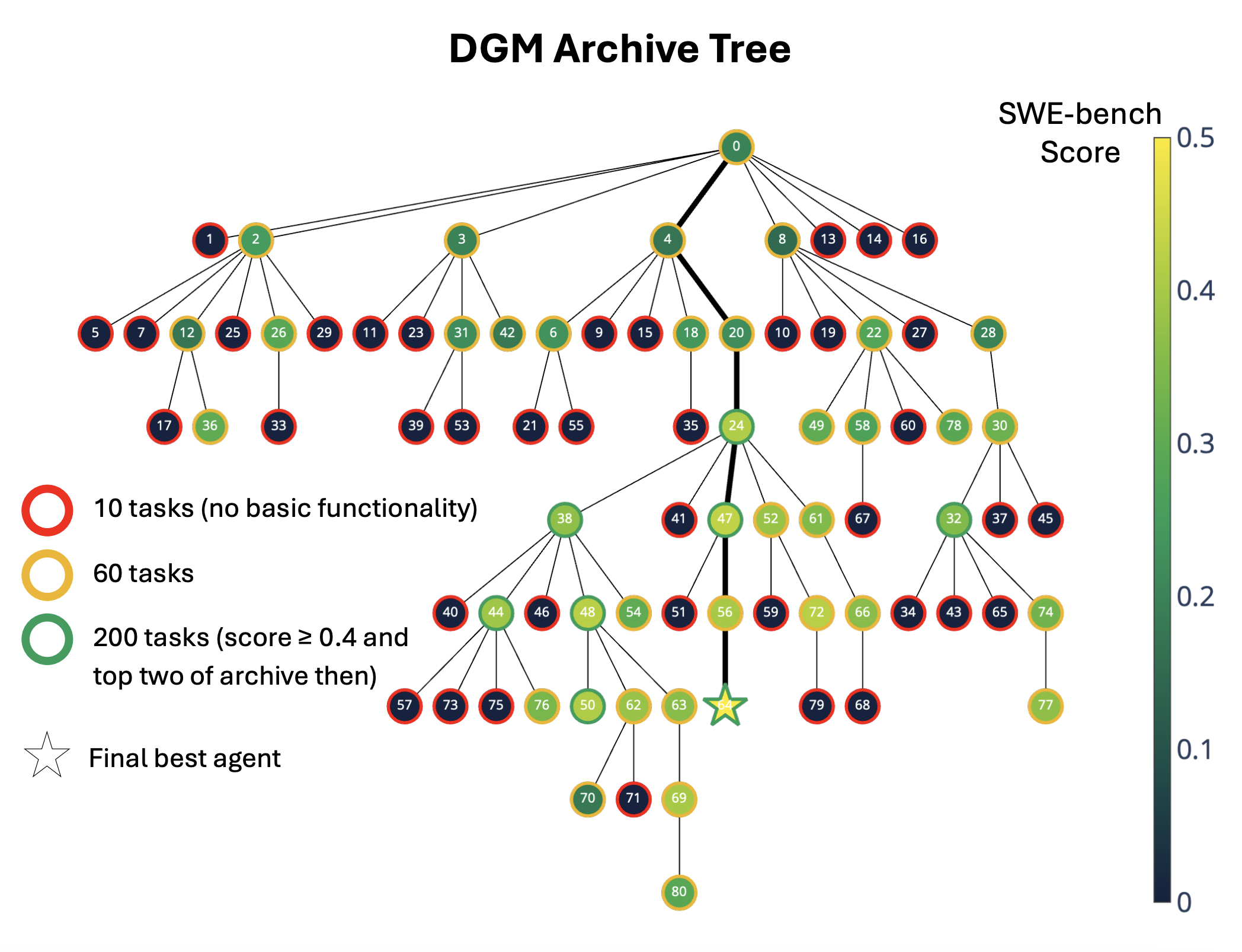 (上図)SWE-benchでのDGM実行中に生成されたコーディングエージェントのアーカイブ。