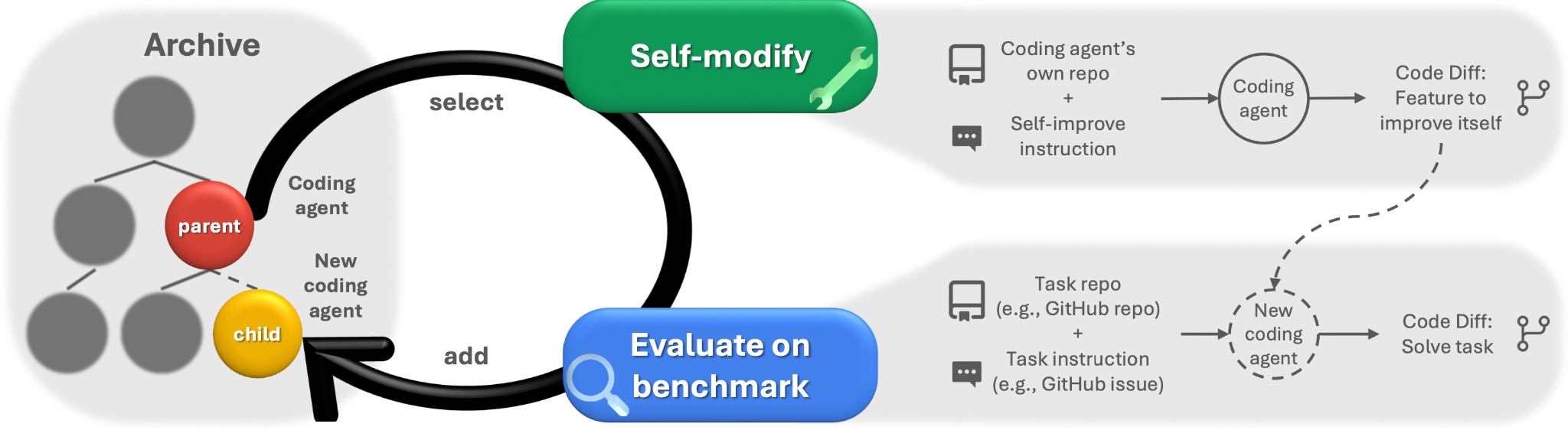 ダーウィン・ゲーデルマシン(DGM)は、オープンエンドな探索の原理により、エージェントを反復的に構築し、そのアーカイブを構成する。自己修正による新しいエージェント生成と、下流タスクによる評価(スコアリング)を交互に行う。