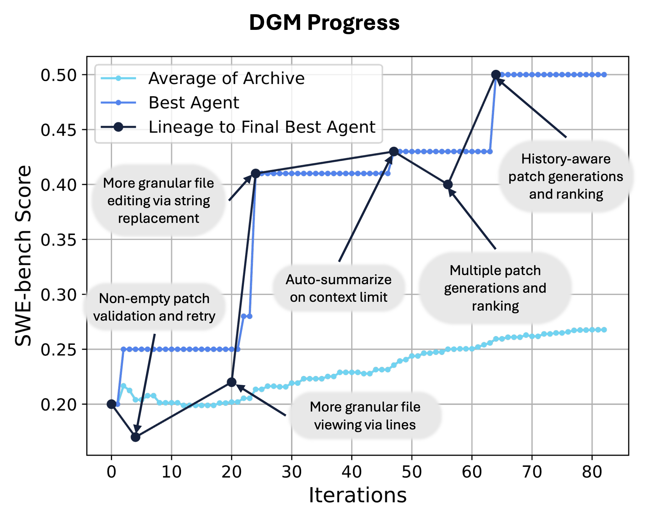 (下図)SWE-benchにおけるDGMのパフォーマンス推移。上図の太線は、最終的に発見された最良エージェントの系統を示す。DGMは、ファイル編集を改善するツールや、複数世代にわたるパッチ戦略を生成しそれをランキングする手法などを発見した。注目すべきは、最終的に最良のエージェントへ至る系統においても、親よりパフォーマンスの低い子エージェントが出現する点である。これは、過去の最高性能エージェントだけでなく、将来の探索に向けた重要な足掛かり(stepping stone)となりうるエージェントもアーカイブしておく、オープンエンドな探索の利点を示している。