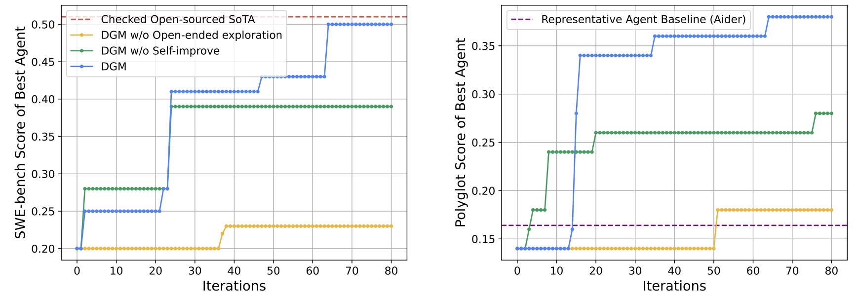 自己改善とオープンエンドな探索により、DGMは継続的に改善する。DGMは優れたコーディングエージェントを自動的に発見し、SWE-bench(左)とPolyglot(右)の両方で高いパフォーマンスを達成した。自己改善またはオープンエンドな探索のいずれかを欠く場合の結果からは、これら二つの要素が継続的な自己改善に不可欠であることが示された。