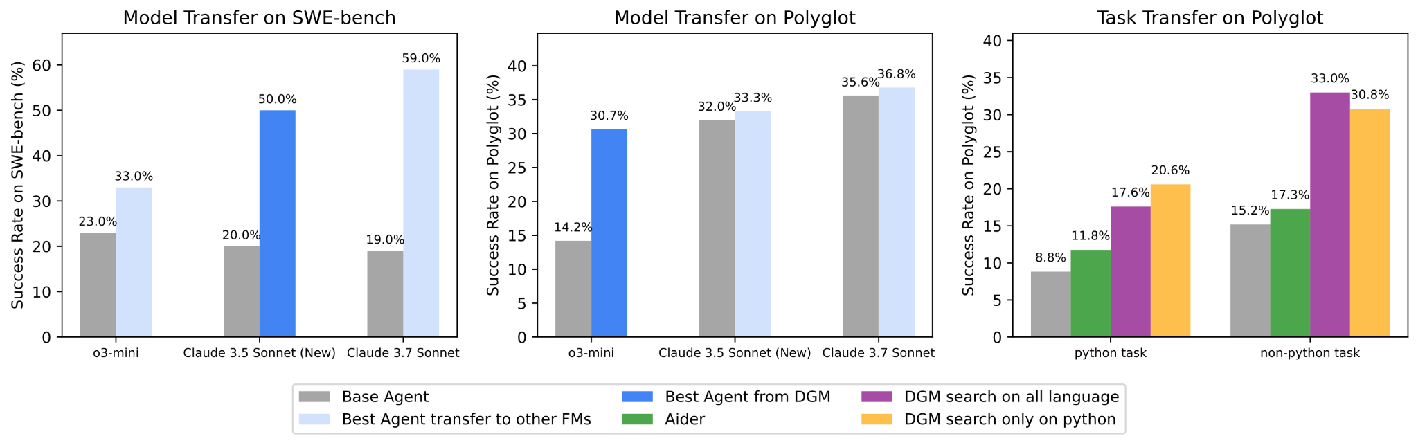 モデル間・タスク間でのエージェントの転移性。DGMによって発見されたエージェントの優れたパフォーマンスは、異なるモデル間(左と中央のパネル)および異なるタスクドメイン間(右パネル)、例えばPythonタスクからRust、C++、Goといった他の言語のタスクへも転移可能である。