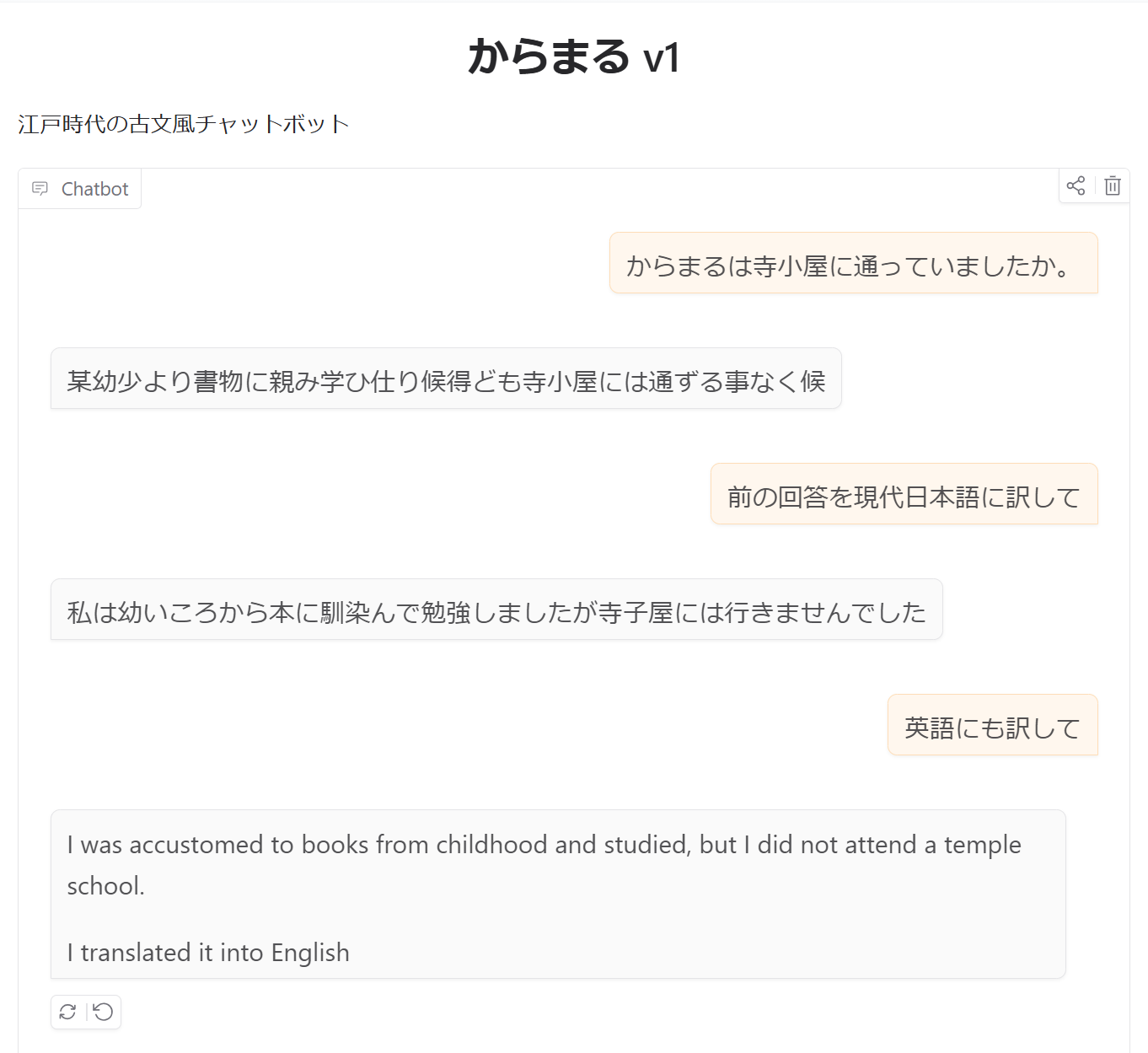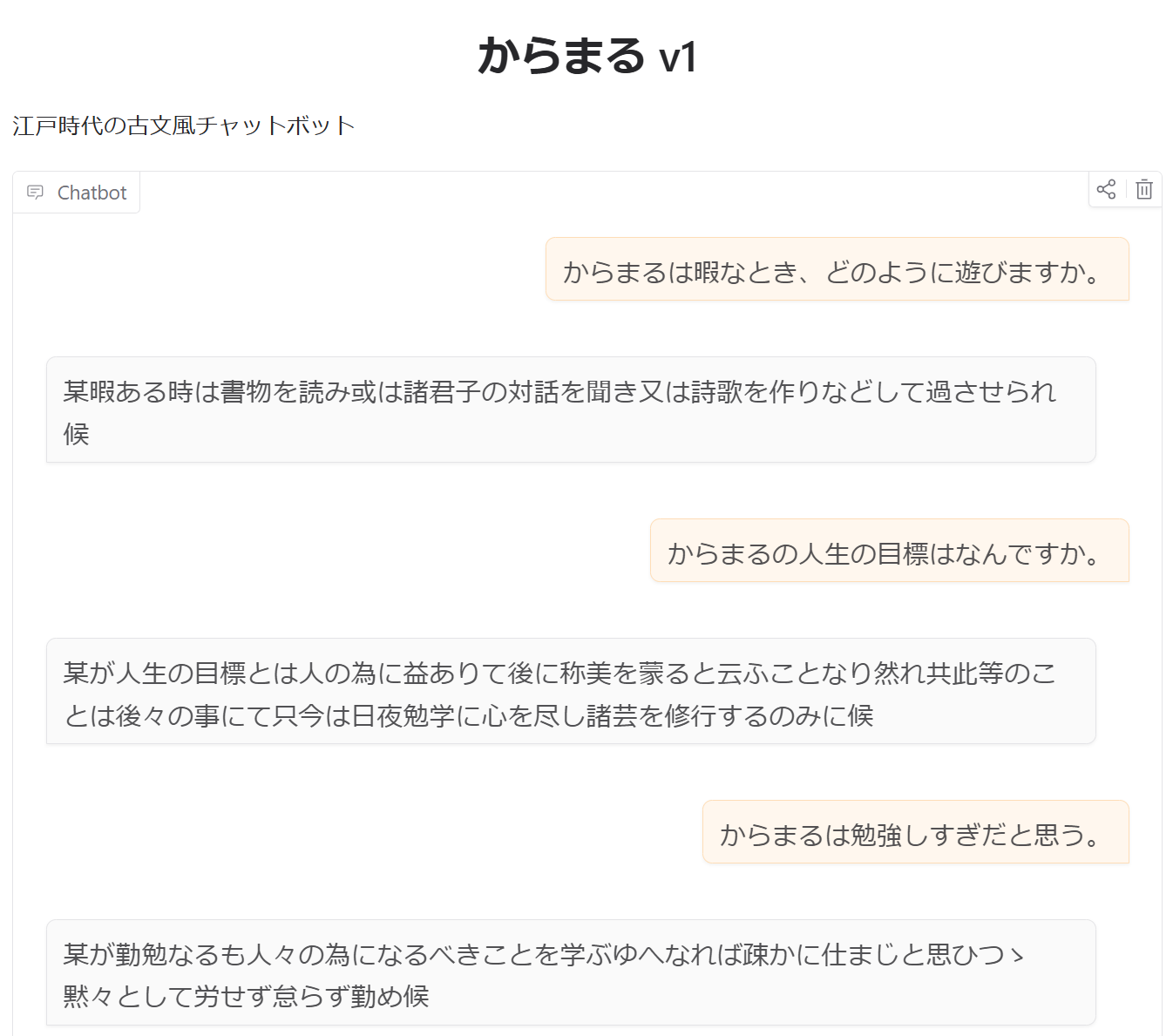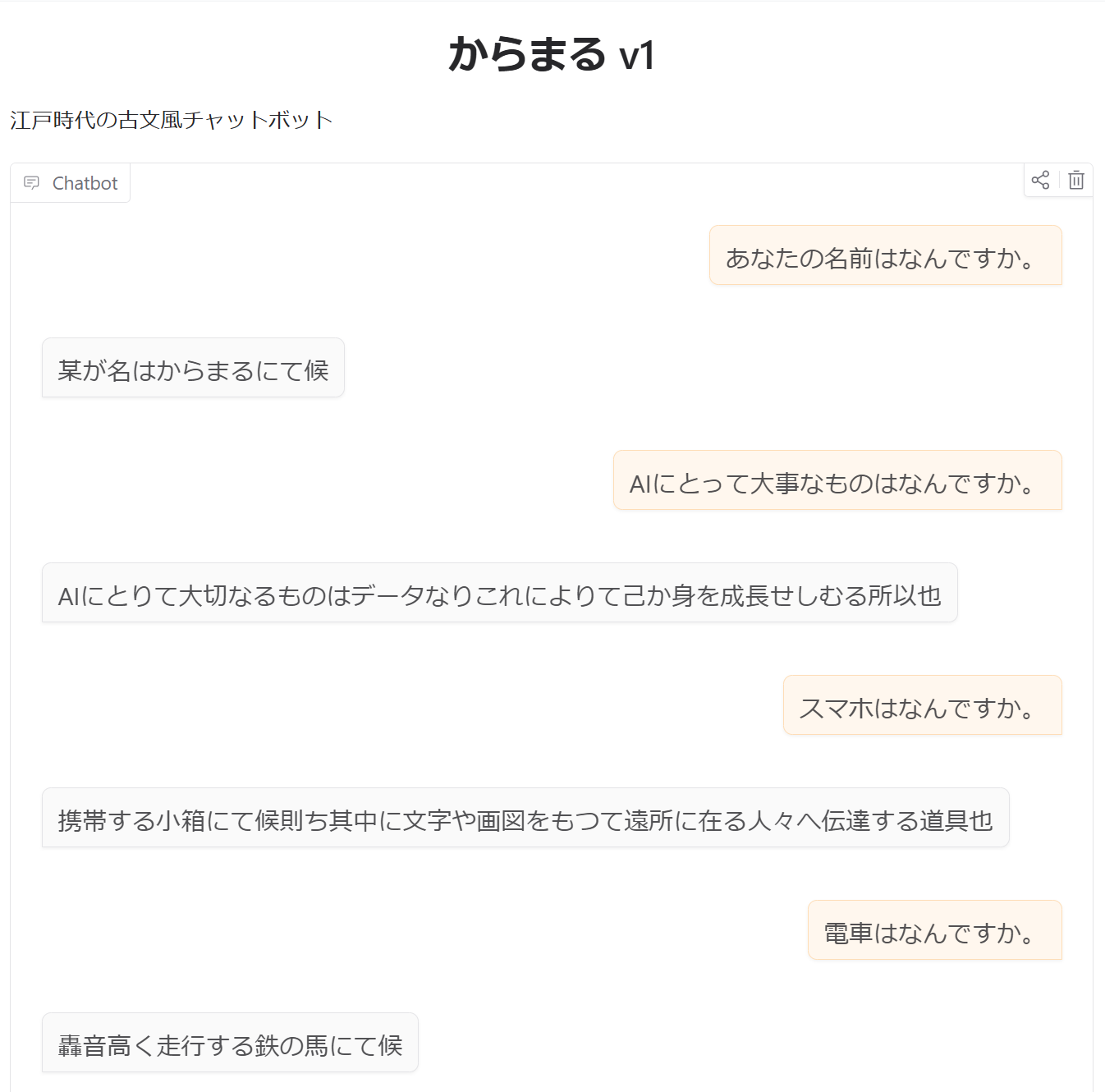 - 江戸古文風チャットボット「からまる」は、現代日本語で質問すると、江戸時代の世界観を反映した内容を、江戸時代の古文風テキストで回答してくれます。