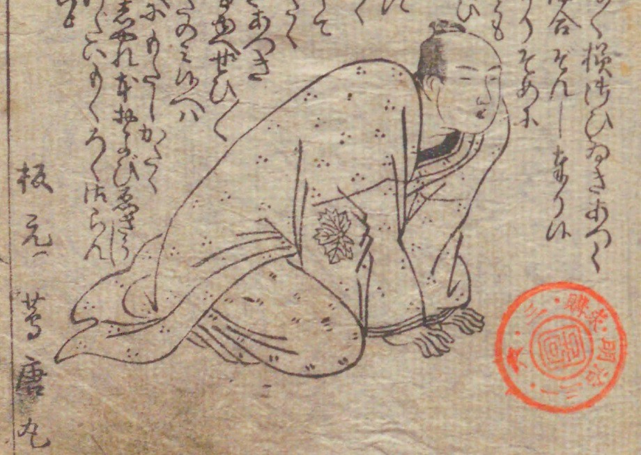 山東京伝作、歌川豊国画『箱入娘面屋人魚』、国立国会図書館デジタルコレクション。画像中央の人物は蔦屋重三郎であり、画像左下に「蔦唐丸」という名前が見える。
