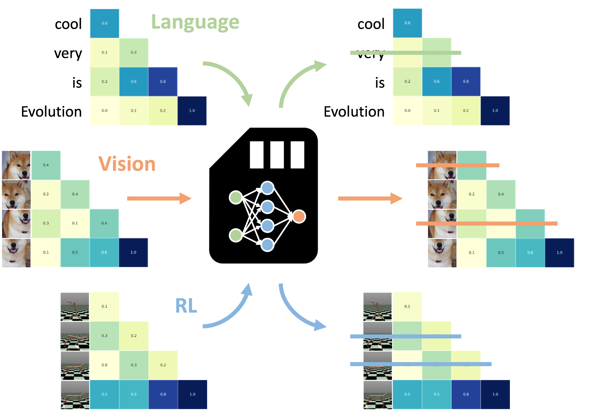Following on in this line of research, our latest breakthrough, detailed in our paper, An Evolved Universal Transformer Memory, introduces a revolutionary memory system for transformers, inspired by how human memory selectively retains and prunes information. Our learned memories not only boost both performance and efficiency of existing, pre-trained transformers, but are also universally transferable across different foundation models, even beyond language, without any re-training!