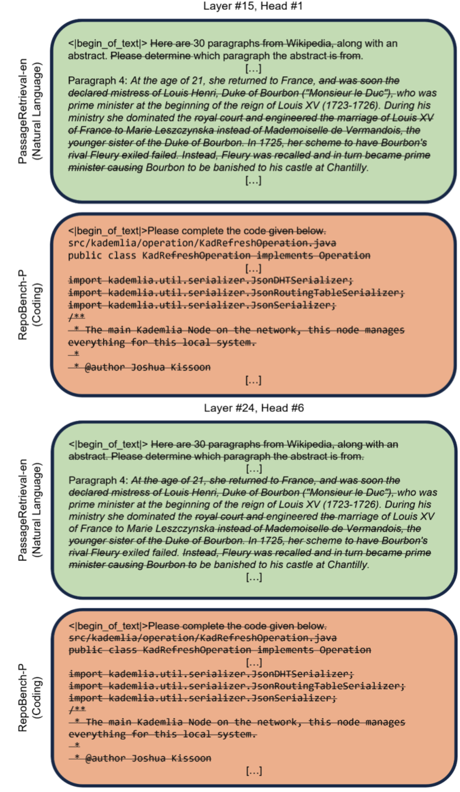 Furthermore, we find that the behavior of NAMMs differs based on the task. In coding tasks, the pruned tokens are mostly contiguous chunks of text, corresponding to whitespace, comments, and unnecessary segments of boilerplate code. Instead, in natural language tasks, NAMMs forget many tokens mid-sentences from the grammatical redundancies of the English syntax, allowing LMs to focus on important names and key concepts.
