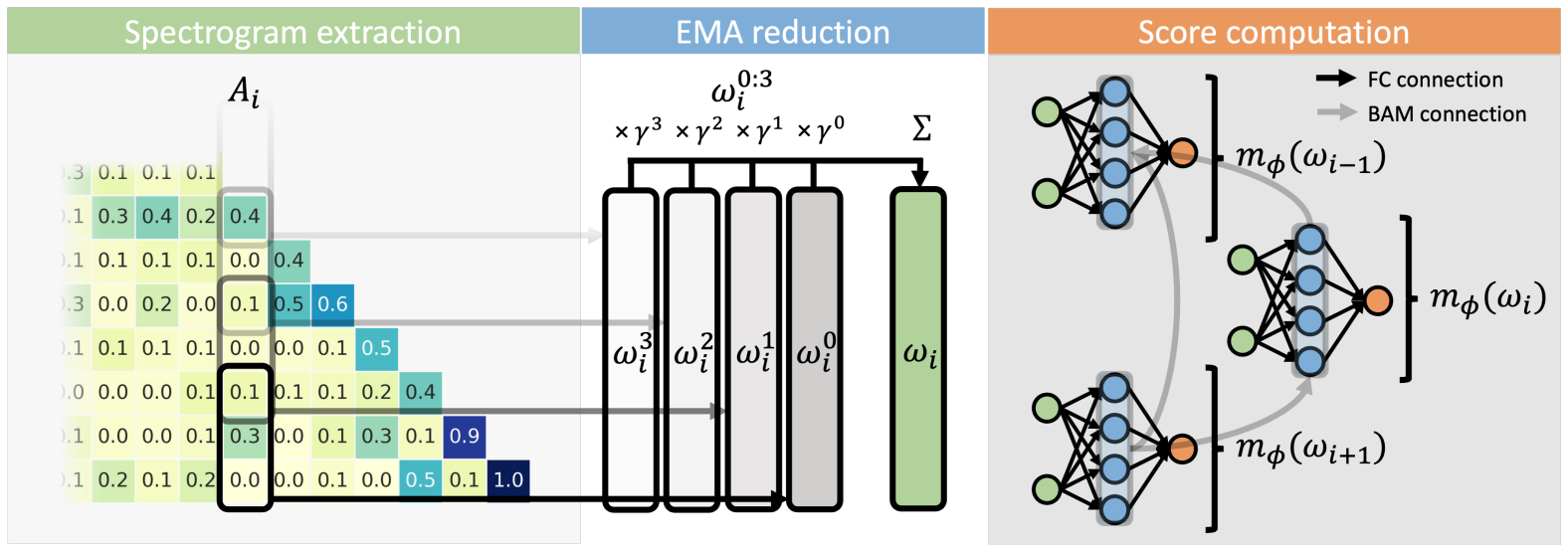 Schematic description of the three main steps in the execution of NAMMs: Processing attention sequences into spectrograms (left), compressing the information with EMA (center), and computing scores to decide what to remember (right).