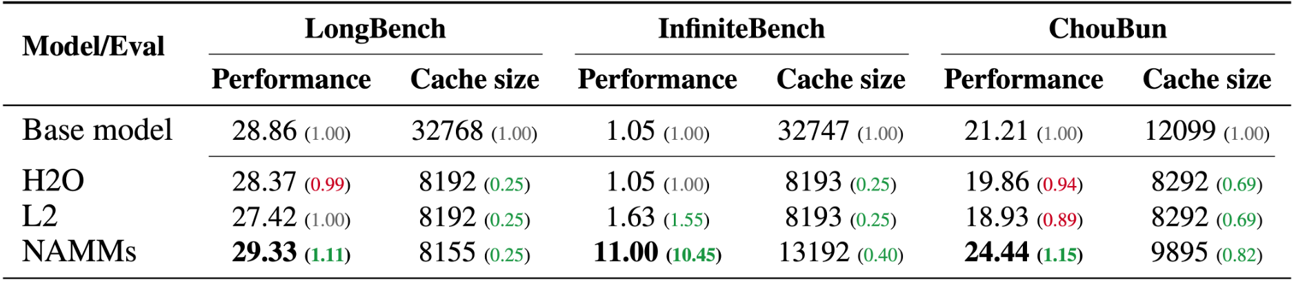 - Supercharged results: With NAMMs, transformers achieve superior results across a wide range of language and coding tasks while requiring less memory.