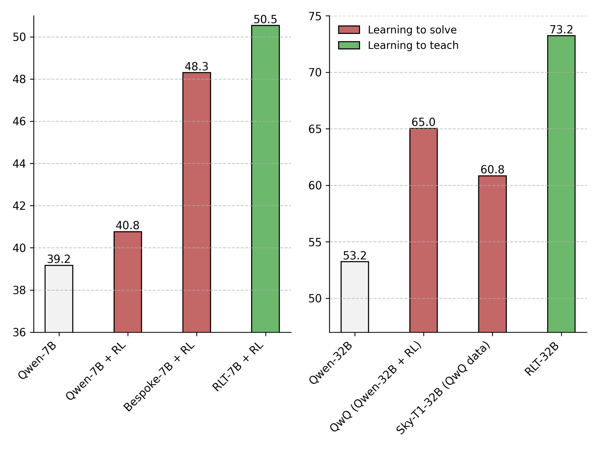 Even so, our much smaller RLT outperformed them across multiple challenging benchmarks in math and science (see table below, top group). Using the same Qwen2.5 student models, the same questions, and the same evaluation setup, our RLT delivered better results with far less computational effort. It set a new standard for both efficiency and effectiveness in teaching reasoning to language models.
