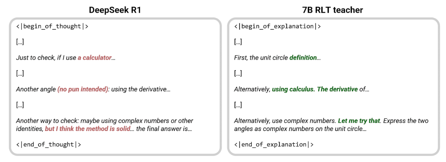 Our method tackles precisely these challenges. Instead of teaching by solving, our new reinforcement-learned teachers (RLTs) “learn to teach”, tasking them to output clear step-by-step explanations based on known solutions, just like great human instructors. Crucially, together with the questions, we also provide the correct answers to our teachers during training, which are now rewarded not for solving problems themselves, but for how helpful their explanations are to the student. This feedback loop aligns teacher training with its true purpose (being helpful to students), making it far more effective. It also allows us to use small, efficient models that wouldn’t otherwise be able to solve problems on their own.