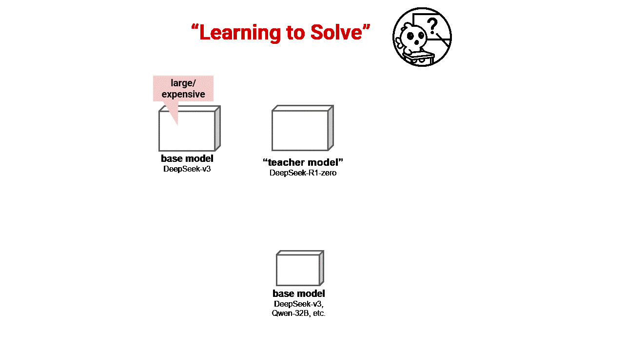 To work around this limitation, researchers often use a two-stage “Learning to Solve” training process. First, a large teacher model is trained with RL to solve problems. Then, its output is carefully filtered and repurposed as training data for a student model, which becomes the final product. This new second phase, illustrated above, is often referred to as distillation or cold-starting. However, two major issues further constrain this process: