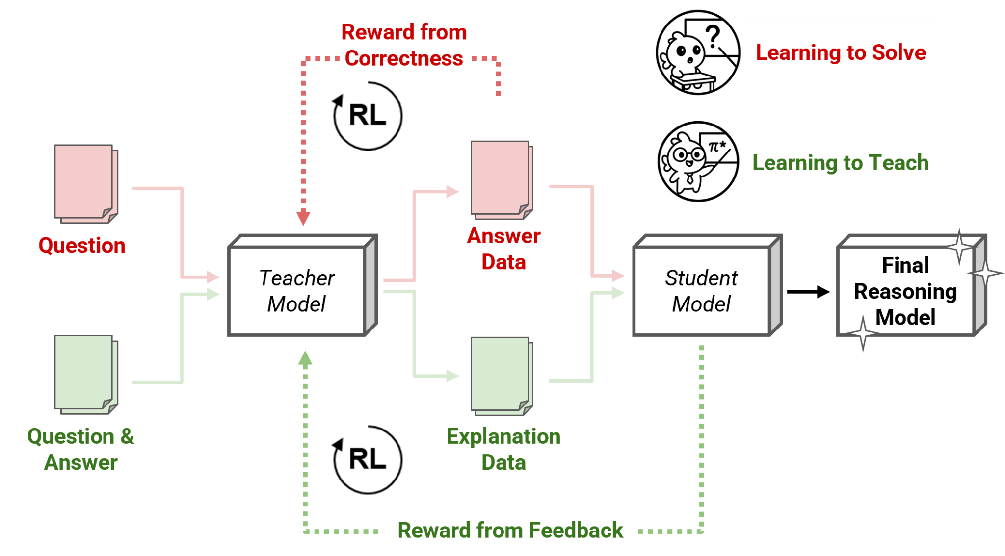 To overcome the limitations of “Learning to Solve”, we introduce a new class of models inspired by how real teachers work, which we call Reinforcement-Learned Teachers (RLTs). Just like a good teacher doesn’t need to rediscover math theorems to explain them, RLTs are given both the question and the correct answer to each problem in their input prompt. Their job is to connect the dots with helpful, step-by-step explanations that a student model can learn from.