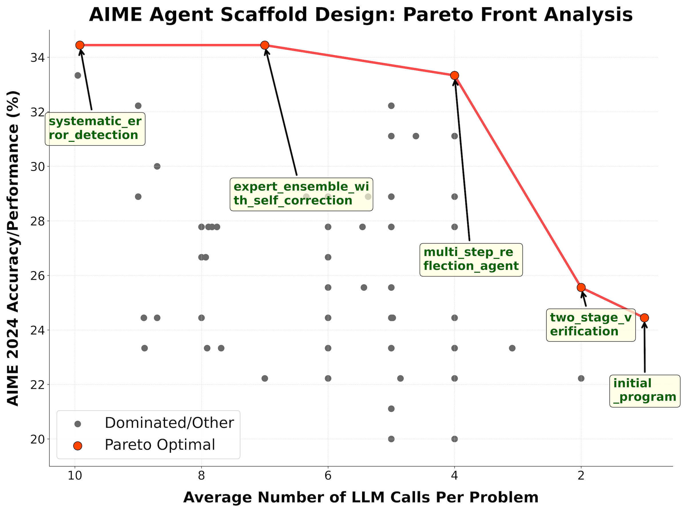 AIME Agent Scaffold Design: Evolving Agentic Systems for Math Reasoning. ShinkaEvolve illuminates the space of agent scaffold designs and discovers a Pareto frontier that trades off math reasoning performance and the number of LLM queries.