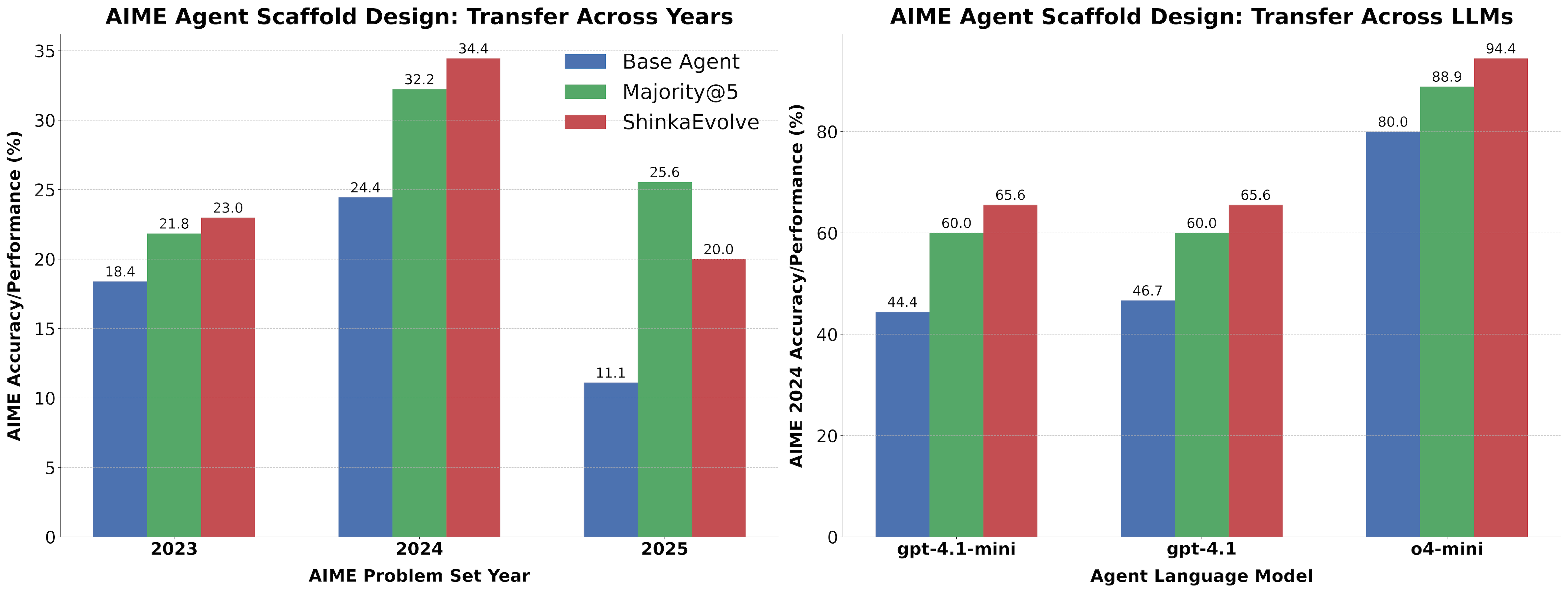 The agent that ShinkaEvolve discovered successfully generalizes to unseen problems from different years and even different underlying LLMs.