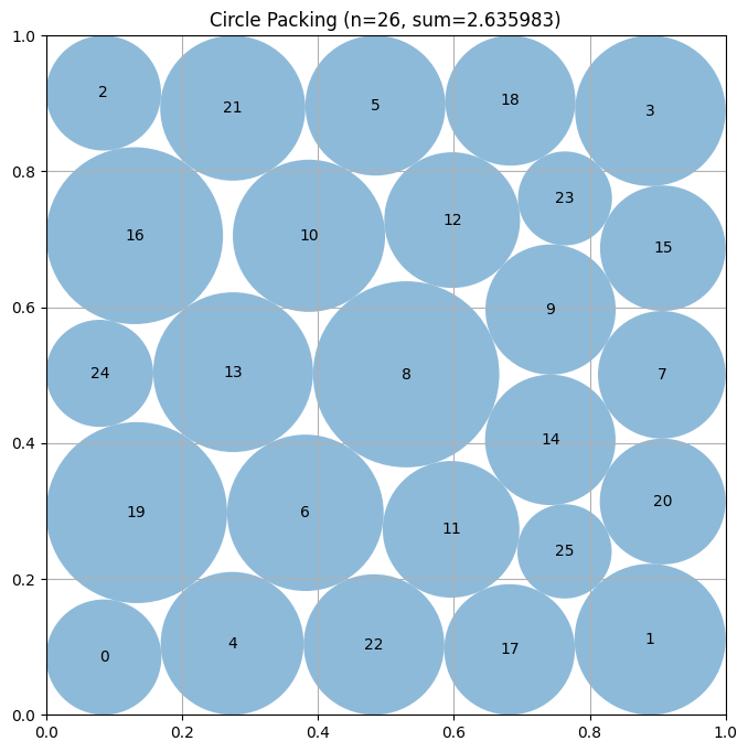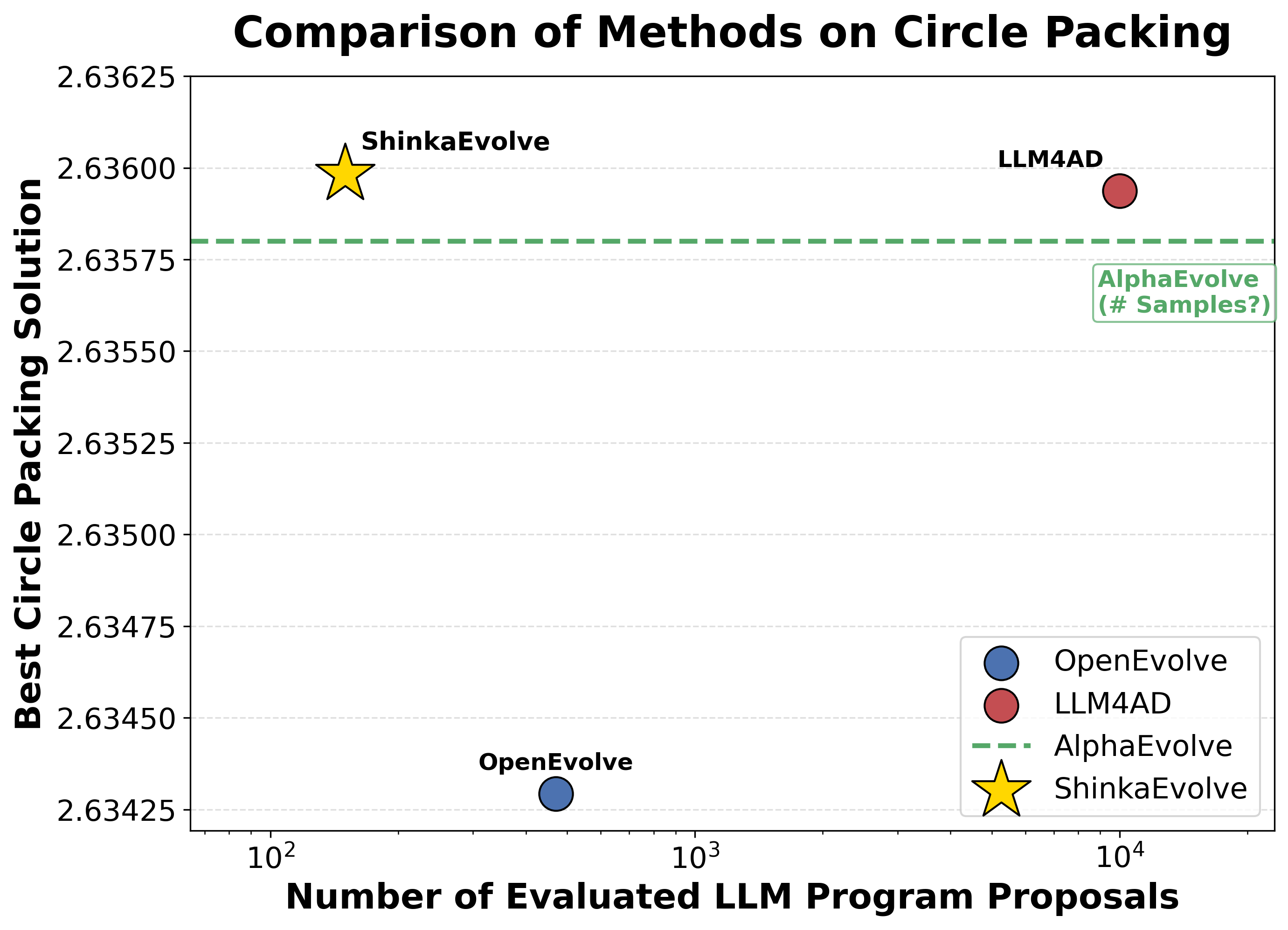 ShinkaEvolve discovered a new state-of-the-art solution for the classic 26-circle packing problem using only 150 samples. As you can see in the chart from our paper, this is a massive leap in efficiency compared to prior work. The discovered algorithm is a sophisticated hybrid of a golden-angle spiral initialization, gradient-based refinement, and simulated annealing to escape local optima.