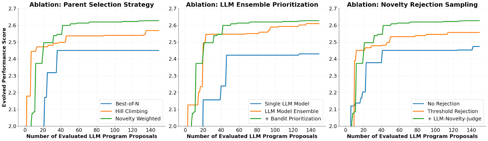 We ran comprehensive ablation experiments to study each individual methodological contribution of ShinkaEvolve. Please read our paper for more details.