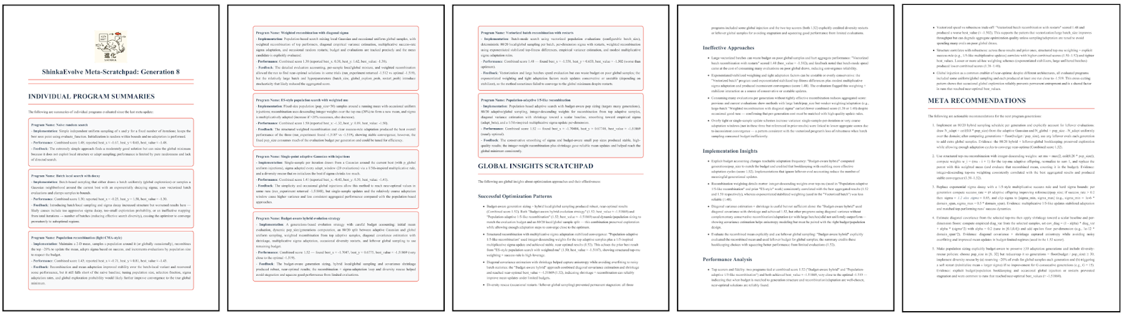 ShinkaEvolve generates a search summary document consisting of previous code proposal summaries, a set of insights outlined in a scratchpad, and recommendations for future solution approaches. This can aid humans in achieving further improvements.
