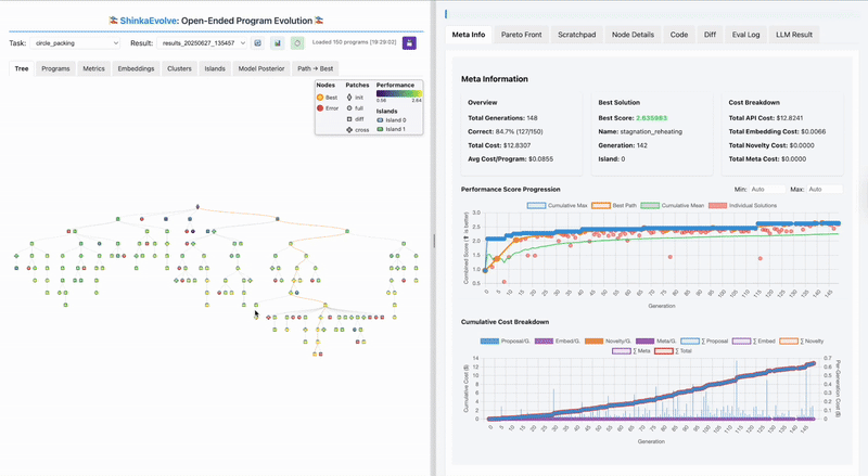 ShinkaEvolve comes with an interactive web interface for monitoring and analyzing program evolution results.