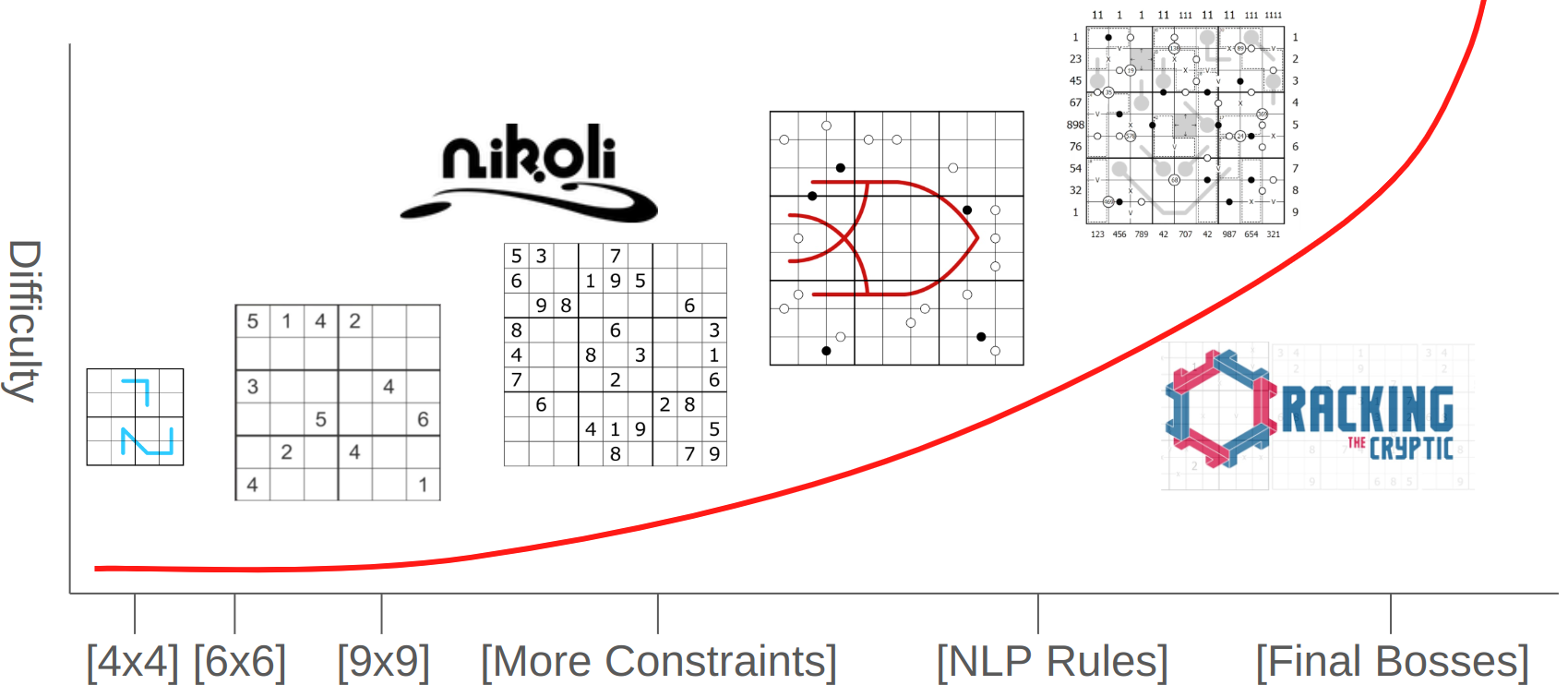 数独は、9×9のマス目の縦・横の各列と3x3のブロック内に数字が重複しないように配置するパズルです。しかし近年では、独自のルールが加わった多様な派生パズルが日々考案されています。これらの「現代数独」(と本記事では呼ぶことにします)は、多段階かつ創造的な推論能力を必要とする一方、正解が一つに定まるため、AIの推論能力を測る試金石として最適です。最難関レベルの現代数独は、人間のチャンピオンでさえ解くのに数時間を要するほどの難度となります。