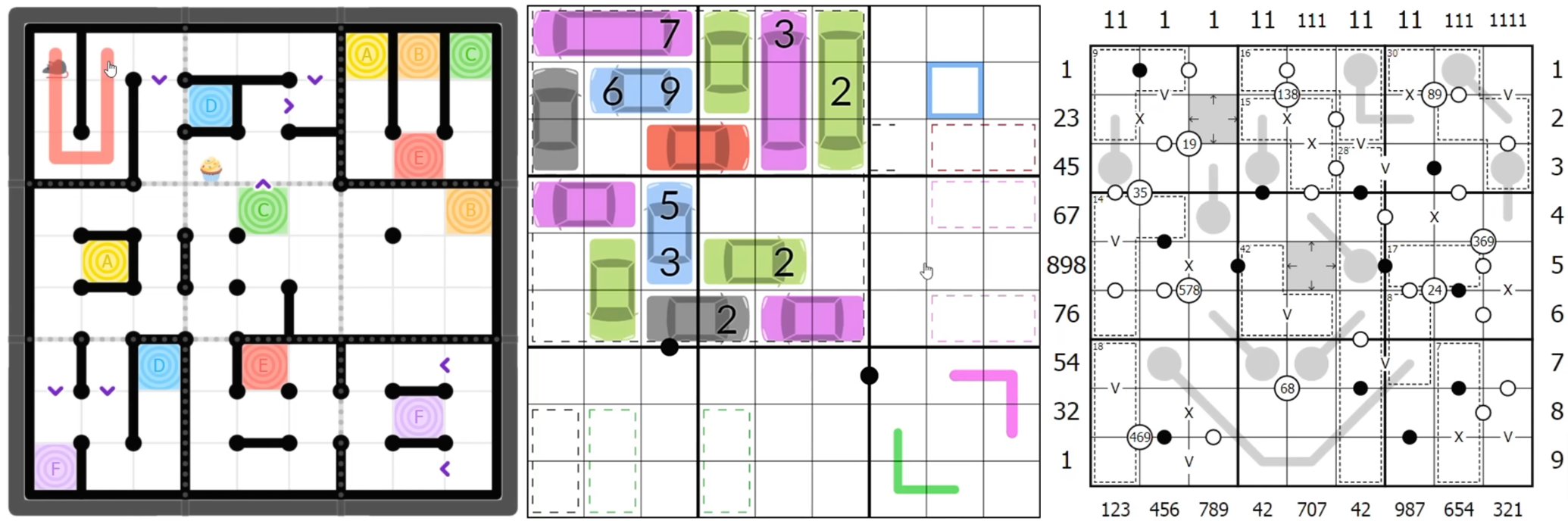 様々な現代数独:(左)RAT RUN 7: Multiple Choice by Marty Sears、(中央)Reserved Parking by rockratzero、(右)Chaotic Wrogn by Under Beyond