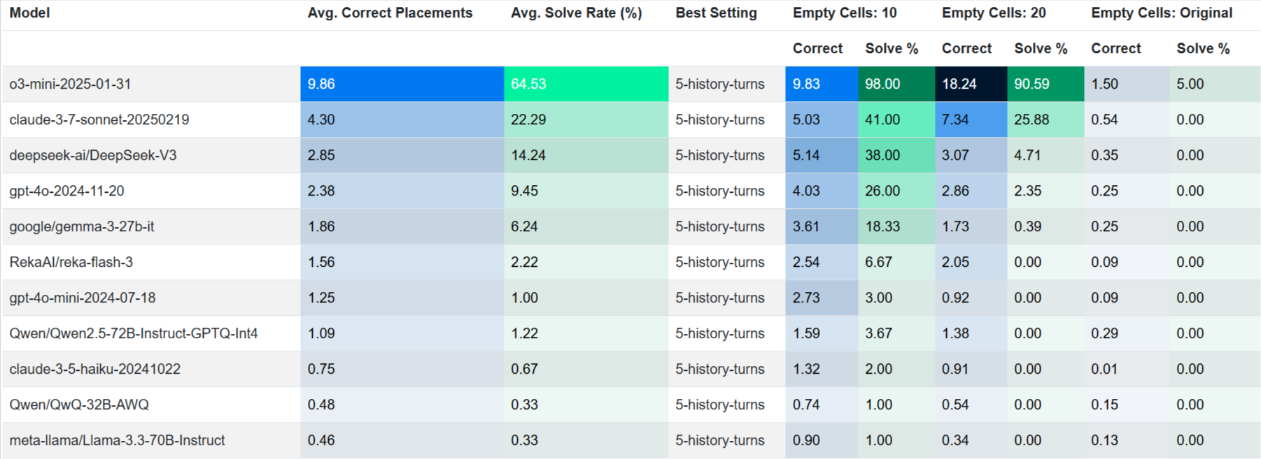 In order to give the models a fair chance, we provided the models with partially completed puzzles and assessed their ability to finish them. Some models performed reasonably well with this assistance, but the key results lie in the final two columns. Even the most advanced models currently fail to place even a single correct digit on average, and Open AI’s latest reasoning model, ChatGPT o3, is the only one capable of solving any puzzles within the benchmark. It’s important to note that a 5% success rate on the benchmark’s puzzles doesn’t equate to 5% progress in solving the benchmark, as these are the simplest puzzles and there is a massive ramp in complexity after that as described earlier.