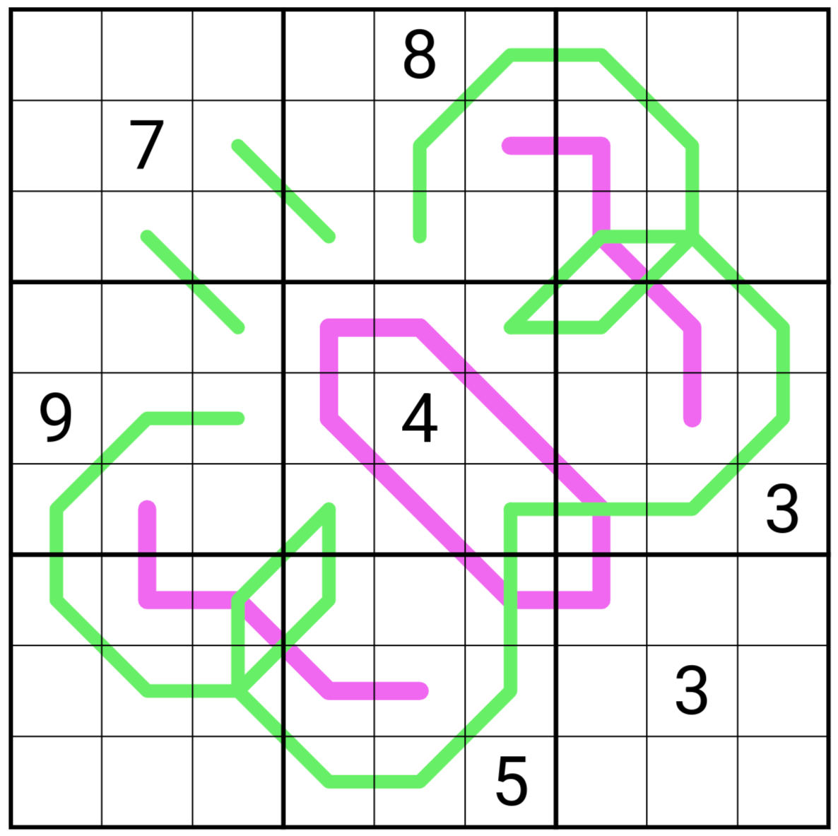 Sudoku is a puzzle that takes place in a 9 by 9 grid partially filled with numbers. The aim is to fill in the missing numbers so that each row, column and 3 by 3 box contain all the numbers from 1 to 9. These can be highly addictive and exploded in popularity in Japan in the 80s thanks to Nikoli’s puzzle books and again in the UK in the 2000s where they started featuring in newspapers. Since these times, the Sudoku puzzle has continued to evolve and now can contain very varied rules, which we call ‘Modern Sudokus’. An example of such a puzzle is below. Not only do you need to match the original rules but the numbers that are along the colorful lines shown have extra rules that need to be followed.