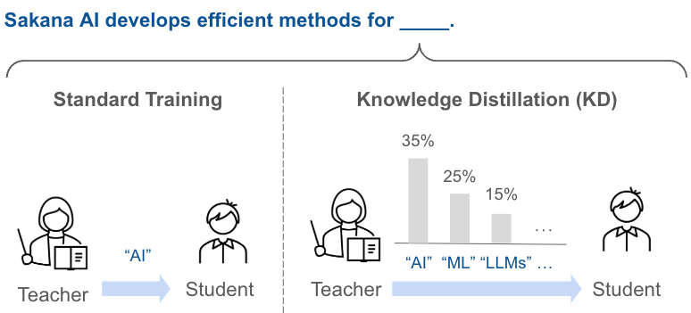 ここでは例として、「Sakana AI develops efficient methods for __」という文中の下線部分(__)の単語を予測することを生徒モデルの目標とします。通常の学習(左)では、正解単語である「AI」という情報のみが生徒モデルの学習に利用されます。