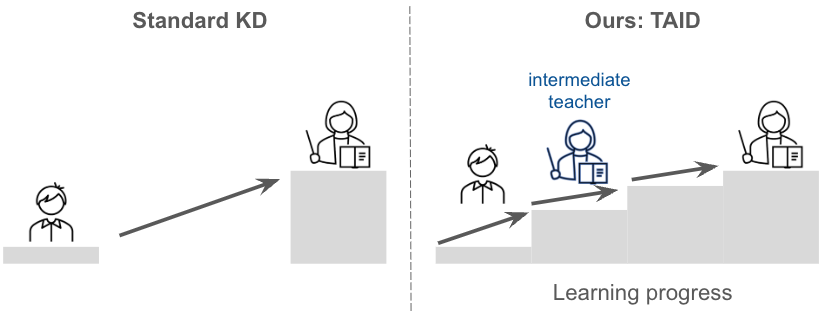 TAIDは上述の課題を解決する新たな知識蒸留の手法です。TAIDでは、生徒モデルの学習進度に合わせて、教師モデルを段階的に変えることで、効果的な知識転移を実現します。