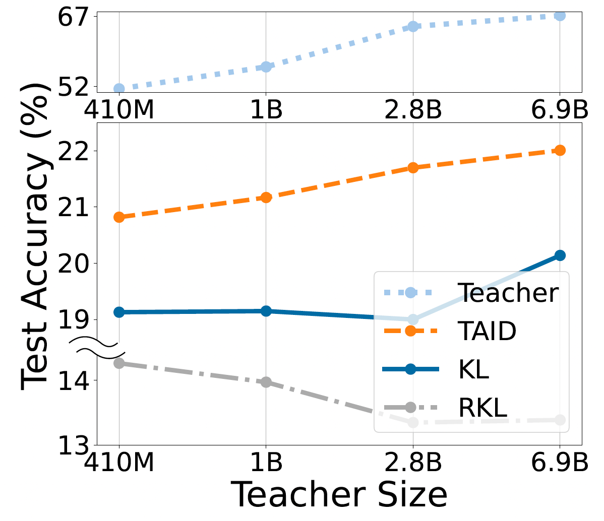 下図は、教師モデルの大きさ(横軸:Teacher Size)を変化させたときの、従来手法とTAIDによる知識蒸留を行った生徒モデルの性能(縦軸:Test Accuracy)を表しております。従来手法(KLおよびRKL)は、教師モデルが大きくなるとむしろ性能が低下してしまうことが確認できます。一方、TAIDは、教師モデルが大きさに比例して、生徒モデルの性能は単調増加しています。これは、TAIDが教師と生徒の能力差を効果的に克服できていることを示しています。
