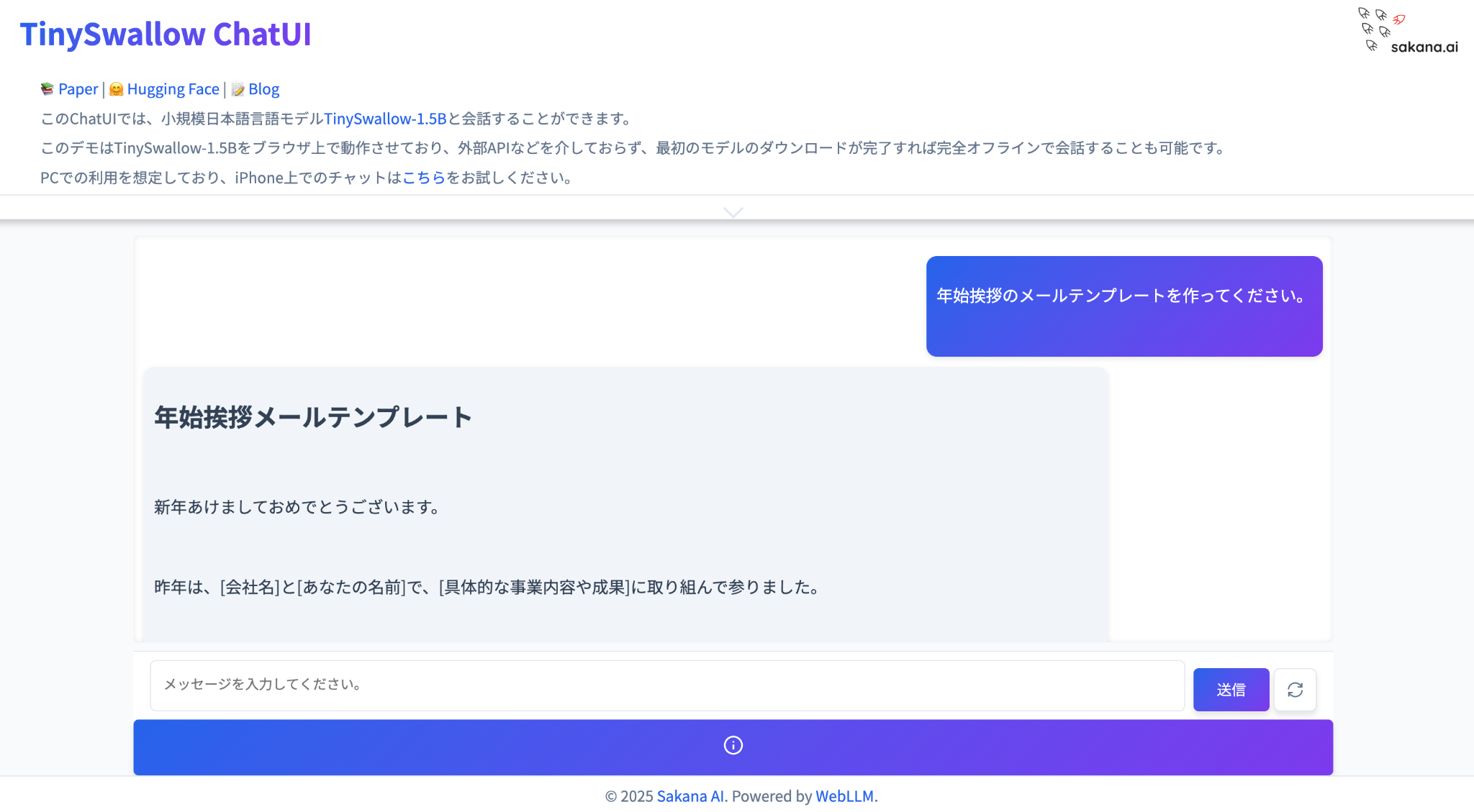 さらに、小規模サイズであるTinySwallow-1.5Bは、PCはもちろん、モバイル端末でのテキスト生成が可能です。概要セクションでお見せしたデモ動画は、TinySwallow-1.5B-InstructをiPhone 14で動作させたときの様子です。ご覧の通り、高速にテキスト生成できていることがわかります。また、PCでの動作を簡単にお試しいただくために、ウェブアプリをご用意しました。