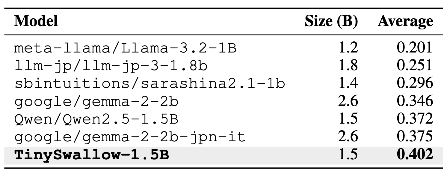 以下の表が示すように、TinySwallow-1.5Bは、日本語での言語モデルベンチマークにおいて、同規模のモデルの中で最高性能を達成しています。