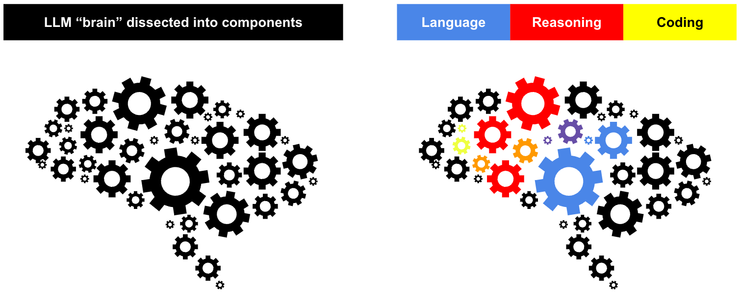 Left: We decompose an LLM’s “brain” (i.e., weight matrices) into several independent components using SVD.