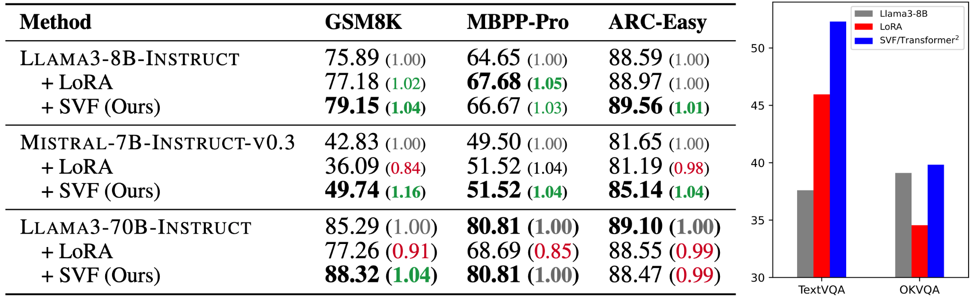 We first set out to obtain the z-vectors by SVF on these tasks, and compare it with LoRA. Our results in the table below show that SVF outperforms LoRA on text-based tasks, with particularly strong gains on GSM8K. This can be attributed to our RL training objective, which does not require “perfect solutions” for each question, unlike LoRA’s fine-tuning approach. The histogram on the right also illustrates SVF’s amazing capacity in the vision domain.