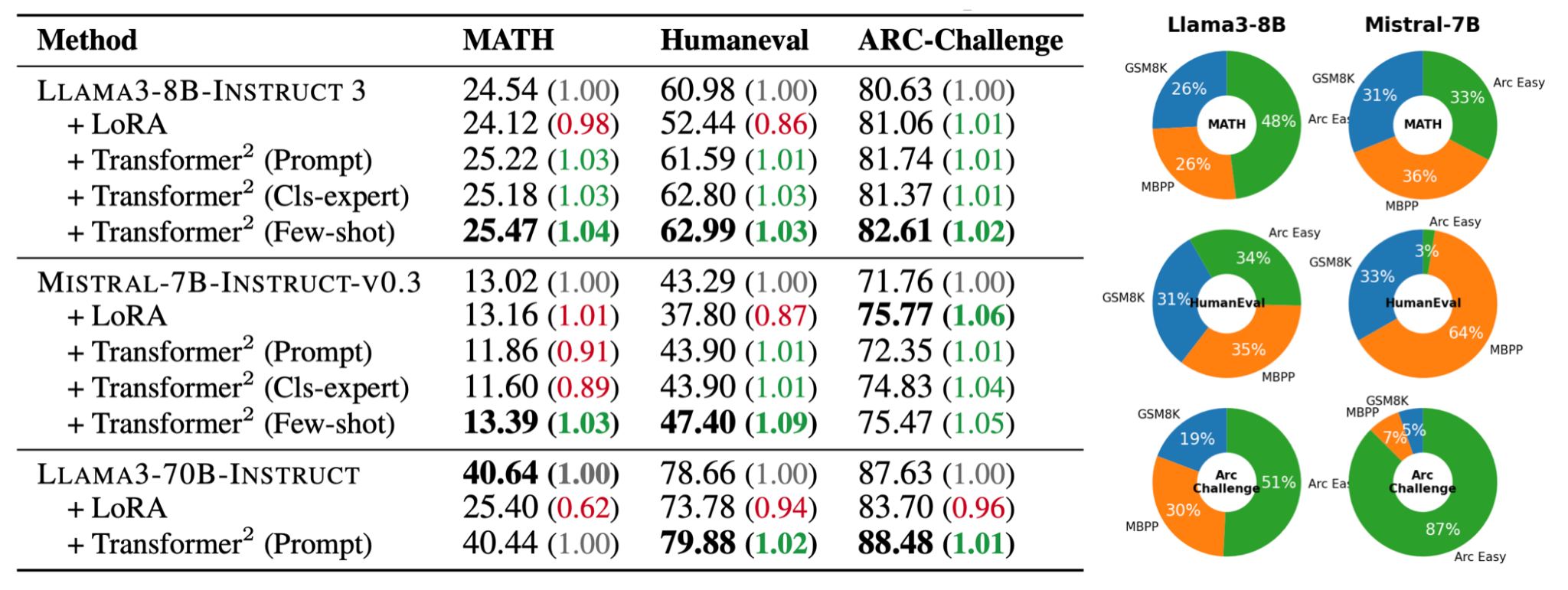 This vision of self-adaptive AI is at the heart of our latest research paper, Transformer² (‘Transformer-squared’), where we propose a machine learning system that dynamically adjusts its weights for various tasks. The name Transformer² reflects its two-step process: first, the model analyzes the incoming task to understand its requirements, and then it applies task-specific adaptations to generate optimal results. By selectively adjusting critical components of the model weights, our framework allows LLMs to dynamically adapt to new tasks in real time. Transformer² demonstrates significant advancements across various tasks (e.g., math, coding, reasoning, and visual understanding), outperforming traditional, static approaches like LoRA in efficiency and task-specific performance while requiring far fewer parameters.
