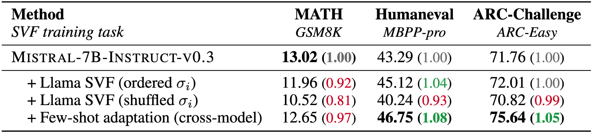 Finally, we explored an intriguing question that challenges conventional wisdom in AI development: Can we transfer the knowledge from one model to another? To our excitement, when taking the learned z-vectors from Llama to Mistral, we observe positive effects with the latter showing improved performance on most tasks. See table below for detailed results.